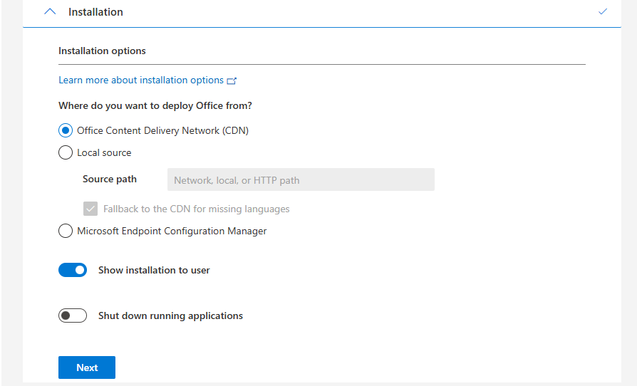 At this step you could host the Office installation files yourself on a local server, which can save on bandwidth if you install the applications 25 times a day. For installations happening once or twice a month, I recommend using the default options: