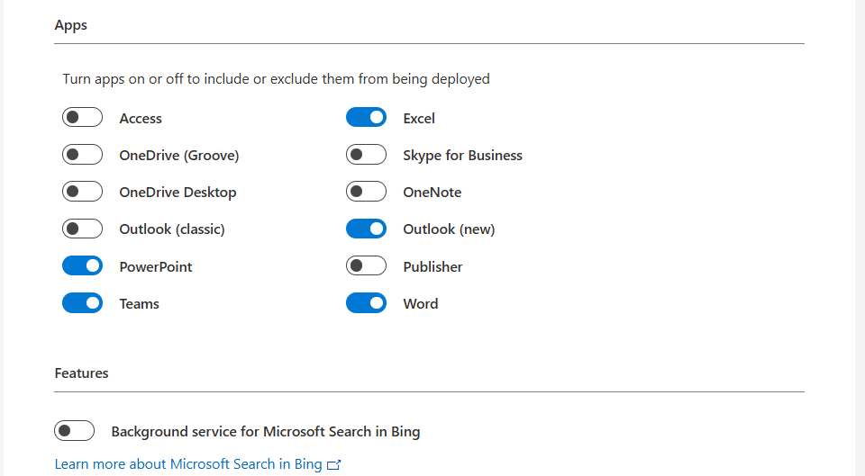 Here we can disable apps our users don’t need like the old Outlook or Access/Publisher. Not installing those applications saves some on storage and compute power. Also we can disable the Microsoft Bing Background service. No further clarification needed.