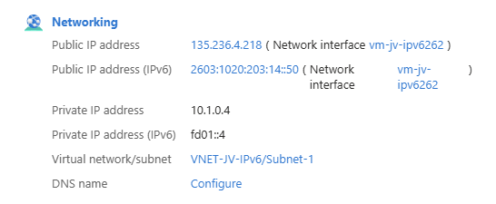 We have now created a Azure machine that is connected to our IPv4 and IPv6 stacked network.