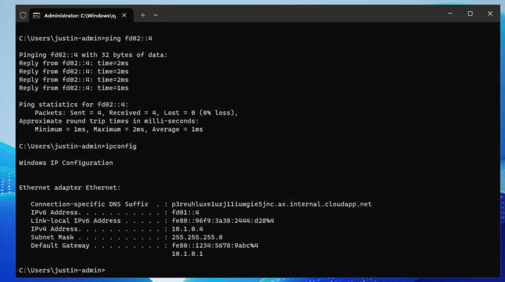 Now we have assigned a new IP configuration on the same network interface so we have both IPv4 and IPv6 (Dual-stack). Lets check this in Windows: