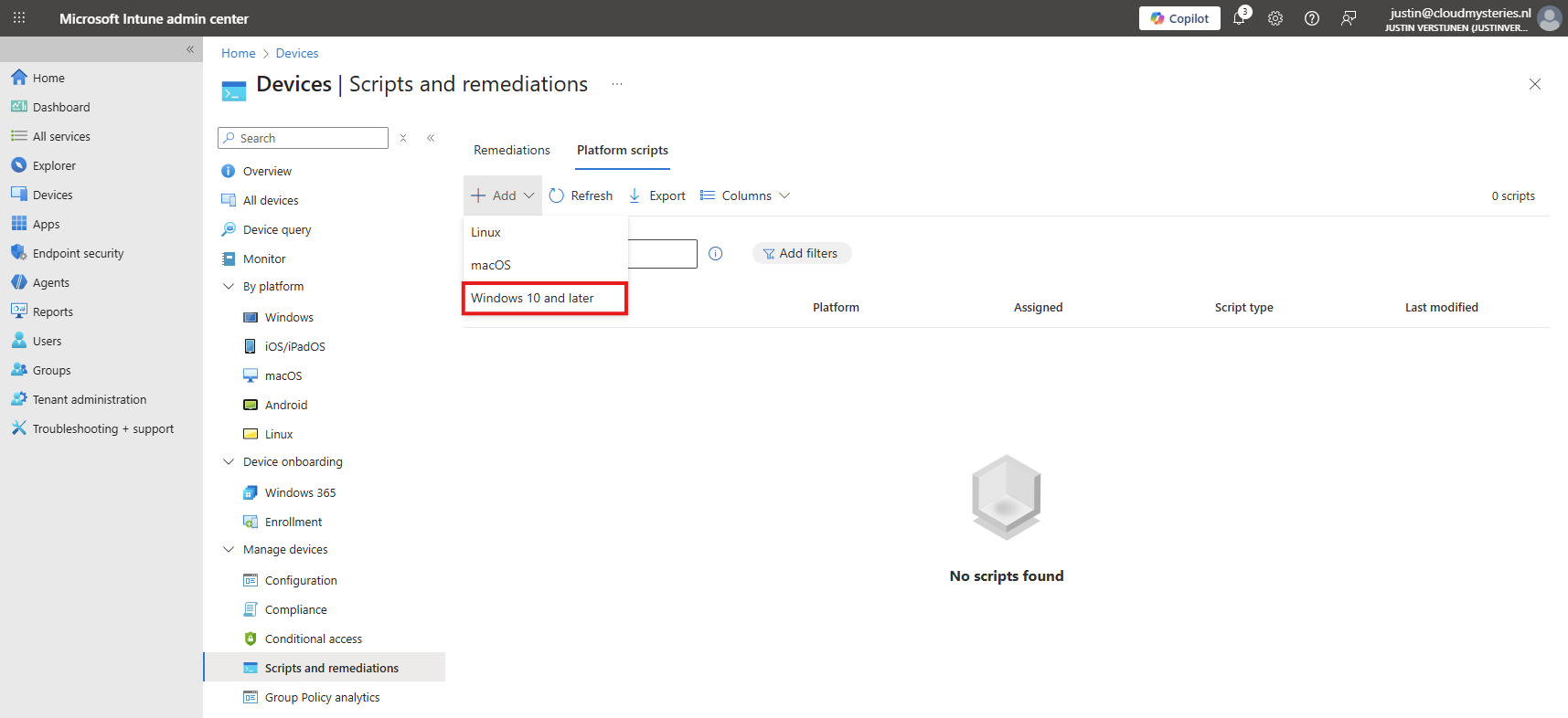 From there, go to Devices -> Windows ->Scripts and remediations and then the tab “Platform scripts”. These are scripts that are automatically run once.