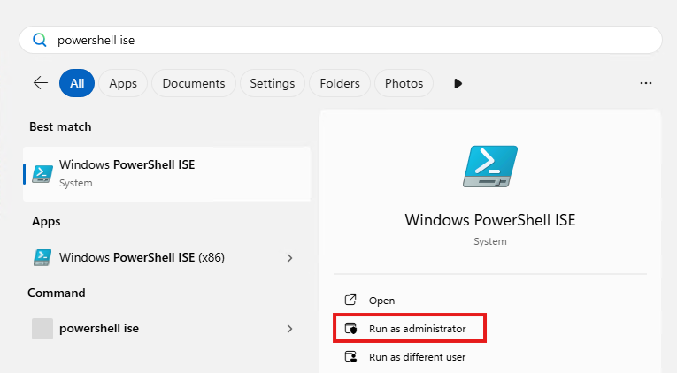 Now open the PowerShell ISE application on your server as administrator.