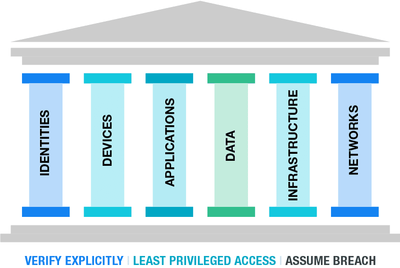 The Zero Trust model is a security model to enhance your security posture by using 3 basic principles, and segmenting aspects of your IT environment into pillars.