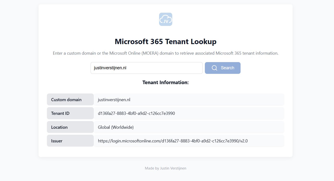The 365 Tenant Lookup is a simple tool to search for Microsoft 365 tenants on their custom domain or .onmicrosoft (MOERA) domain to get the associated Tenant ID and location.