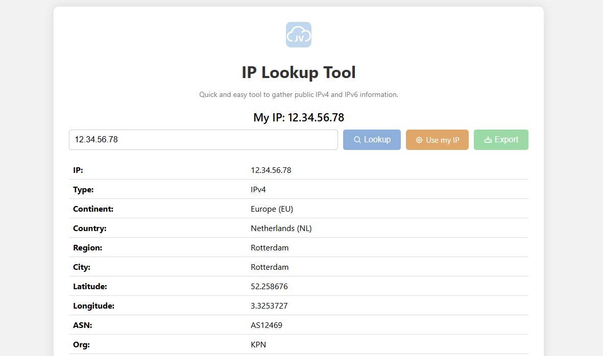 A simple tool to lookup IPv4 or IPv6 addresses to view some of it’s properties, like Internet Provider (ISP), Country, Location and more. The tool also has an Export function for your documentation.