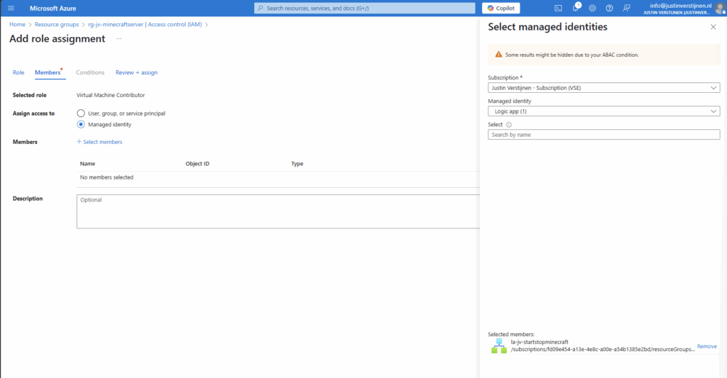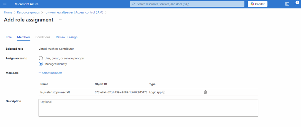 Now we have to give this Managed Identity permissions to a certain scope. Since my Minecraft server is in a specific Resource Group, I can assign the permissions there. If you create flows for one specific machine in a resource group with multiple machines, assign the permissions on the VM level instead.