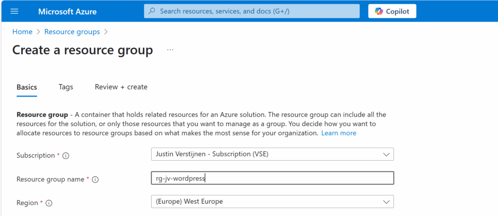 We have to prepare our Azure environment for WordPress. We begin by creating a resource group to throw in all the dependent resources of this WordPress solution.