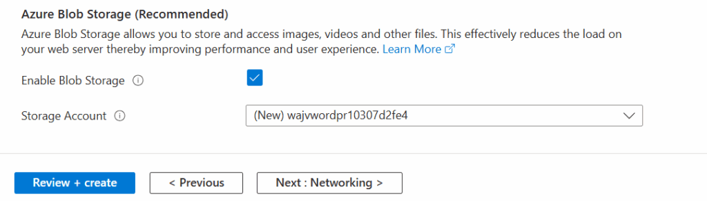This automatically creates an storage account. Then go to the “Networking” tab.