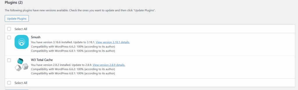 Update everything by simply selecting all and clicking on the “Update” buttons: