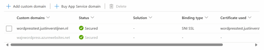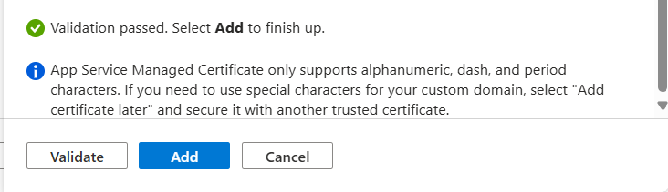 Click on “Add” to finish the wizard. After adding, a SSL certificate will be automatically added by Azure, which will take around a minute.